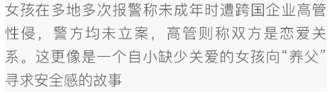 在特稿开头,一句“这更像是一个自小缺少关爱的女孩向‘养父’寻求安全感的故事”,给整个性侵案件定了个调。
