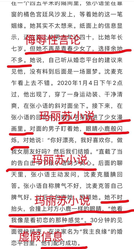 2020年3月30日,该记者同样在某传媒上提供了一篇特稿,题目是《姻缘陷阱:一场无人负责的亲密约会》。