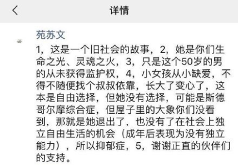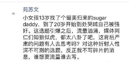 而撰写该文章的记者,直接在朋友圈给整个事件下结论,称这是一个13岁女孩找了一个留美归来的“糖爸”的故事。