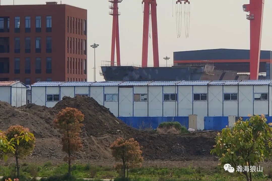 第一,从外在的综合环境来看,有阔叶景观树刚刚发出新芽。这明显是樱花一类,已经开过花,新芽仍然是橙绿色;旁边的针叶树还呈现偏黄而没有完全返青;土堆上的草也是刚刚冒出来的新绿;长得还都不算长。这些植物的特征,都是亚洲大陆东部沿海大约北纬30度附近,在4月上旬前后几天的景观。时间和位置都没有问题。而景物中的楼房,白色的临时工棚,大型风雨棚和一大一小两台龙门吊,这些地标特征,也只有大家都知道的某单位具备。因此这就是普通游客在某岛可以接近的外围的开放道路上,从北向南的方向取景的产物。当然重点是图中的船舶模块,从近到远,都是呈现上大下小的U型或者V型。这都是高速穿浪船体需要的必然造型。普通的民船虽然在船头和船尾的偏尖锐部分也有这样的造型。