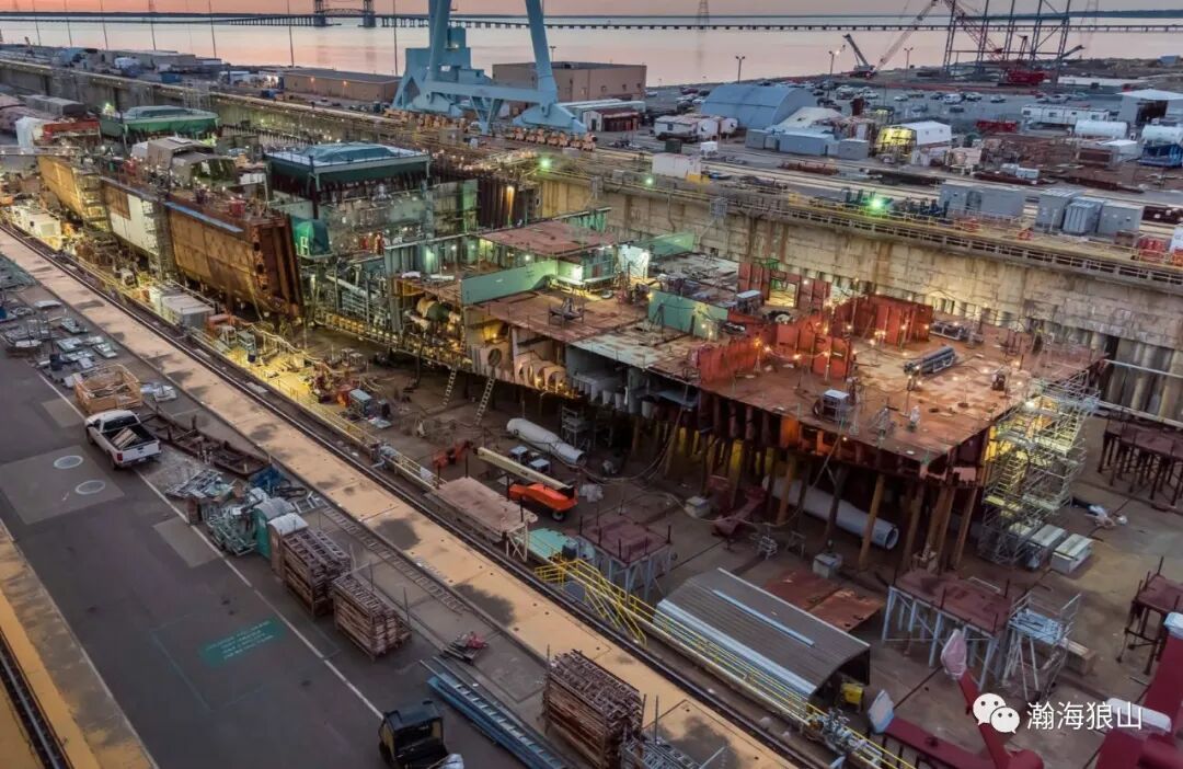 该船从第一个模块出现在同步建设的总组平台的轨道上,到现在已经有大约19个月了。如此“慢”的进度,绝非任何普通货轮的船东可以接受。之所以在陆地总组平台上“墨迹”接近2年。现在看来就是有大量的预舾装工作,要在陆地平台上安装好封舱后再入坞,也就是入坞的船体,内部最重要的五脏六腑都已经基本具备了。剩下的坞内工作,除了两大段焊接合拢,就是快速吊装机库模块和舰岛这些“小活”,坞期最多不超过10个月。从目前的状态看,首舰在上半年就有极高的概率分两次入坞。那么同一陆地总组平台上,会立即看到大量的全新船身模块。