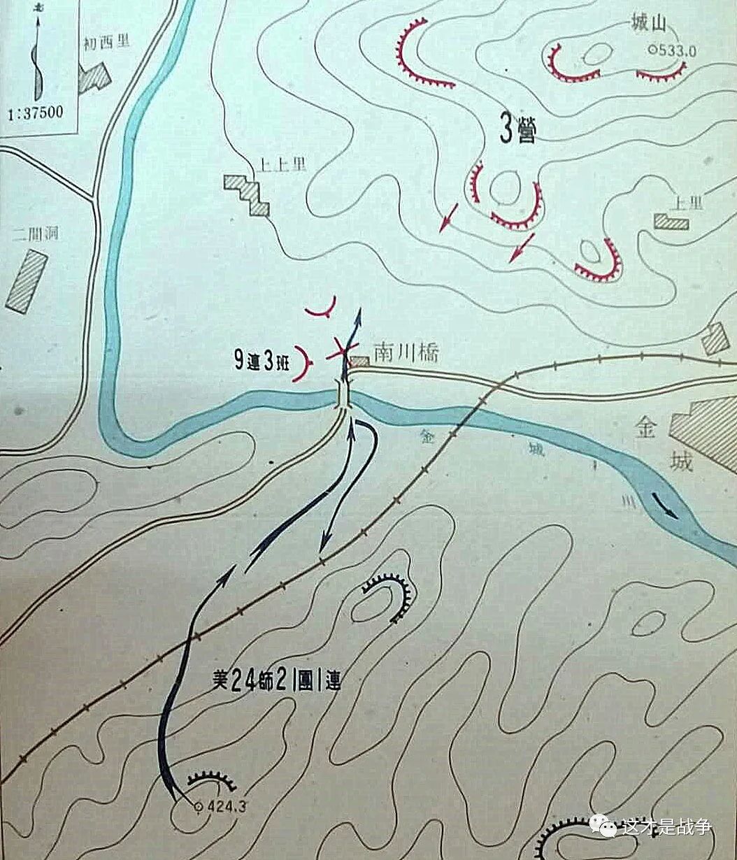 既然胃口这么大,那就必须做好伏击战斗中的关键一点,选择有利地形。3班选择的地形是金城川上的南川桥,南川桥北面就是城山,我们有一篇志愿军六十八军老战士回忆的,最后阻止美军第九军秋季攻势的地方。而南川桥是通往城山的必经之路,桥北地形起伏,树木稠密,是个伏击的理想地点。