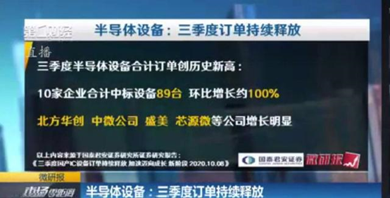 国内IC 设备厂商在前道设备领域,2020年Q3 合计中标量创历史新高。